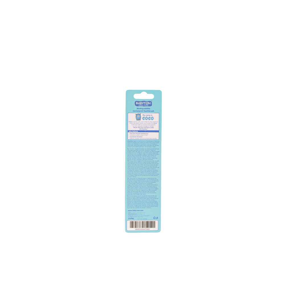 Laat je kind op een veilige en milieuvriendelijke manier tandenpoetsen met de Babyton Bio Tandenborstel Blauw Coco. Deze blauwe tandenborstel is gemaakt van biologische, duurzame materialen en reinigt tanden en tandvlees zacht en effectief, ideaal voor jonge kinderen.