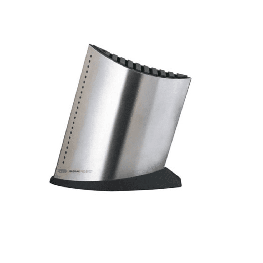 Luxe in RVS: dit bootvormige messenblok van Global is niet alleen functioneel, maar ook een kunstwerk op je aanrecht. Met ruimte voor je volledige messencollectie en een stevige, stabiele basis is het de perfecte mix van design en nut.