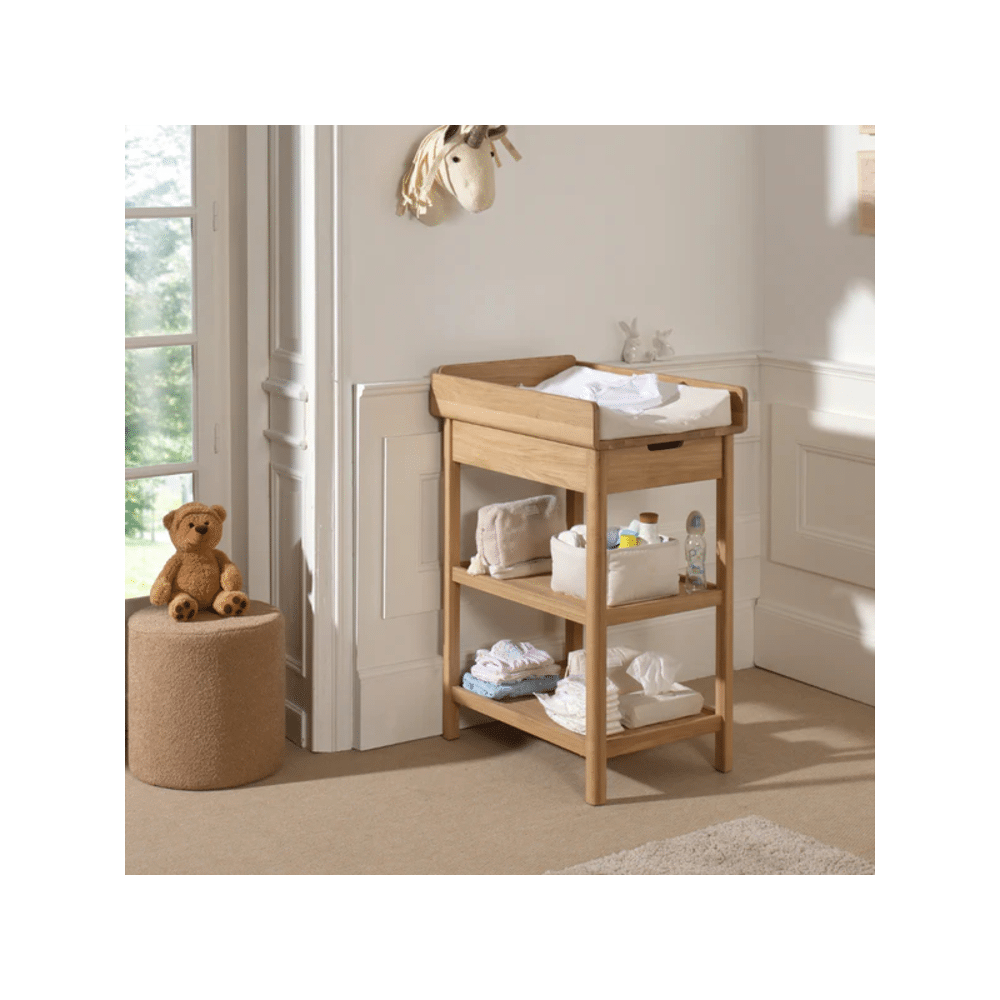 Gemaakt van hoogwaardig eikenhout, is de tafel duurzaam en eenvoudig schoon te maken. Het ergonomische werkblad zorgt voor comfort bij het verschonen van je baby.