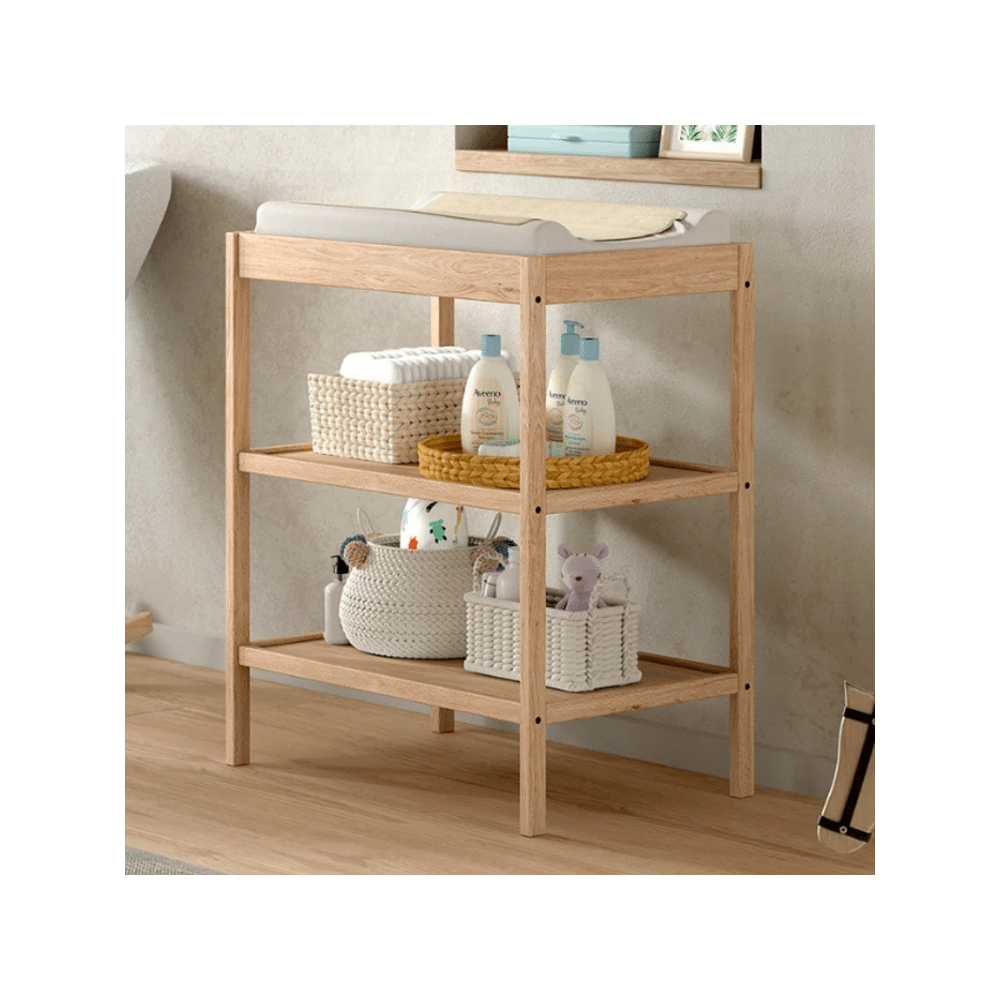 Deze tafel combineert praktisch gemak met stijlvol design. Het ruime oppervlak en de twee open planken bieden voldoende ruimte voor al je babybenodigdheden.