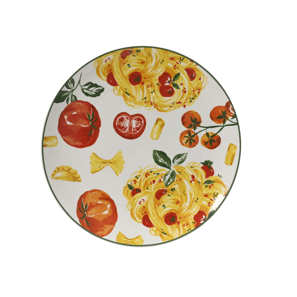 Geef je dinertafel een speelse upgrade met dit kleurrijke dinerbord van Kitchen Goods. Het levendige tomaten- en pastapatroon zorgt voor een uitnodigende sfeer, terwijl het hoogwaardige porcelein garant staat voor elegantie en duurzaamheid. Perfect voor wie van een vrolijke tafelschikking houdt zonder in te boeten aan stijl.