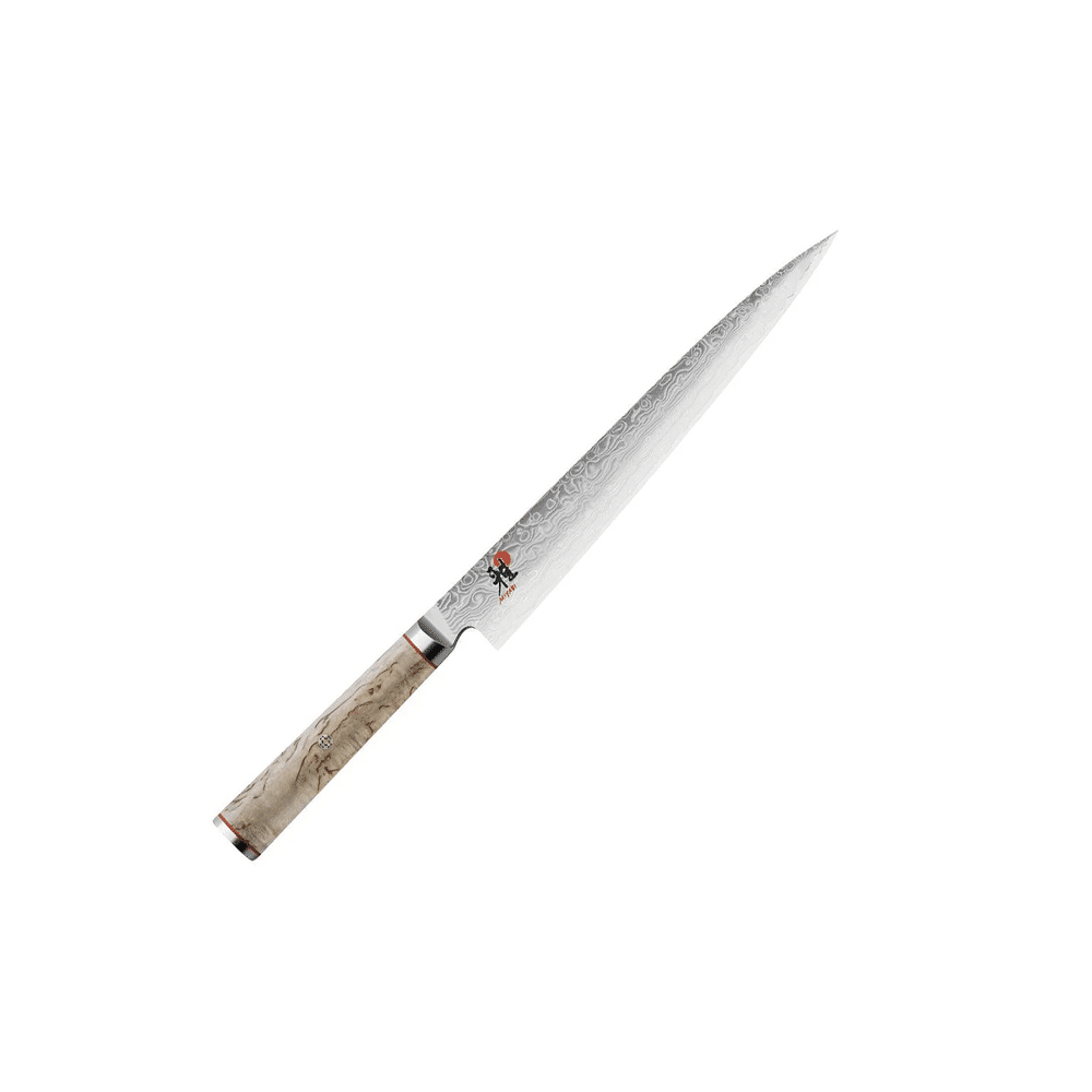 De Miyabi 5000MCD Sujihiki 24 cm is hét mes voor wie professioneel wil trancheren. Met zijn lange, smalle lemmet glijdt het moeiteloos door vlees, vis of gebraad zonder te scheuren. De kern uit MC63-staal wordt omhuld door maar liefst 100 lagen staal met een prachtige damasttekening. De vlijmscherpe Honbazuke-slijpwijze zorgt voor ongeziene snijprecisie. Een luxe mes voor de gepassioneerde hobbykok of professional.