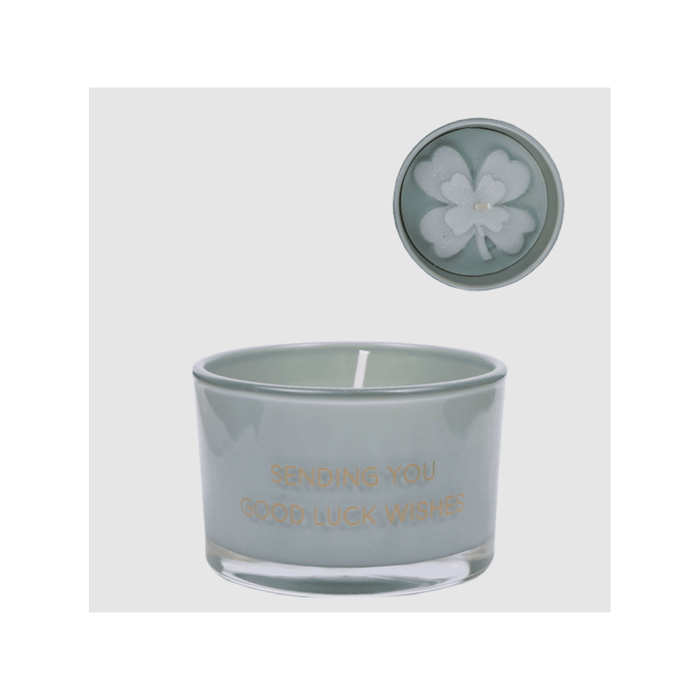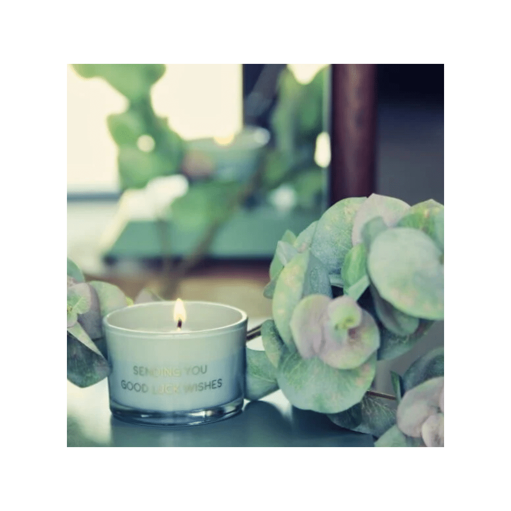 • Gemaakt van biologische sojawas met de tekst 'Sending you good luck wishes' in gouden letters.