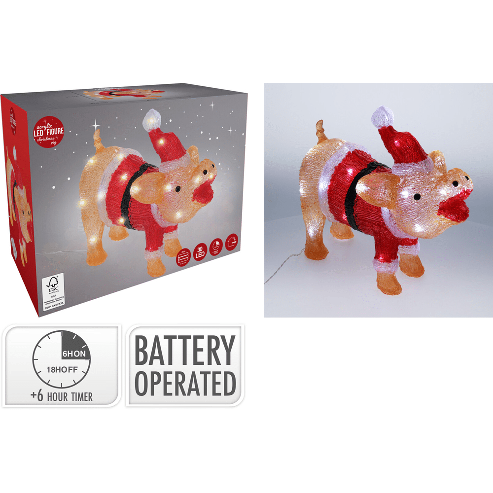 Dit varken is niet alleen een blikvanger, maar ook slim en weerbestendig. Of het nu donker, nat of koud is: hij blijft vrolijk schijnen. Gemaakt van stevig acryl en geschikt voor zowel binnen als buiten dankzij de IP44-bescherming.- 30 fonkelende LED-lichtjes voor een warme gloed